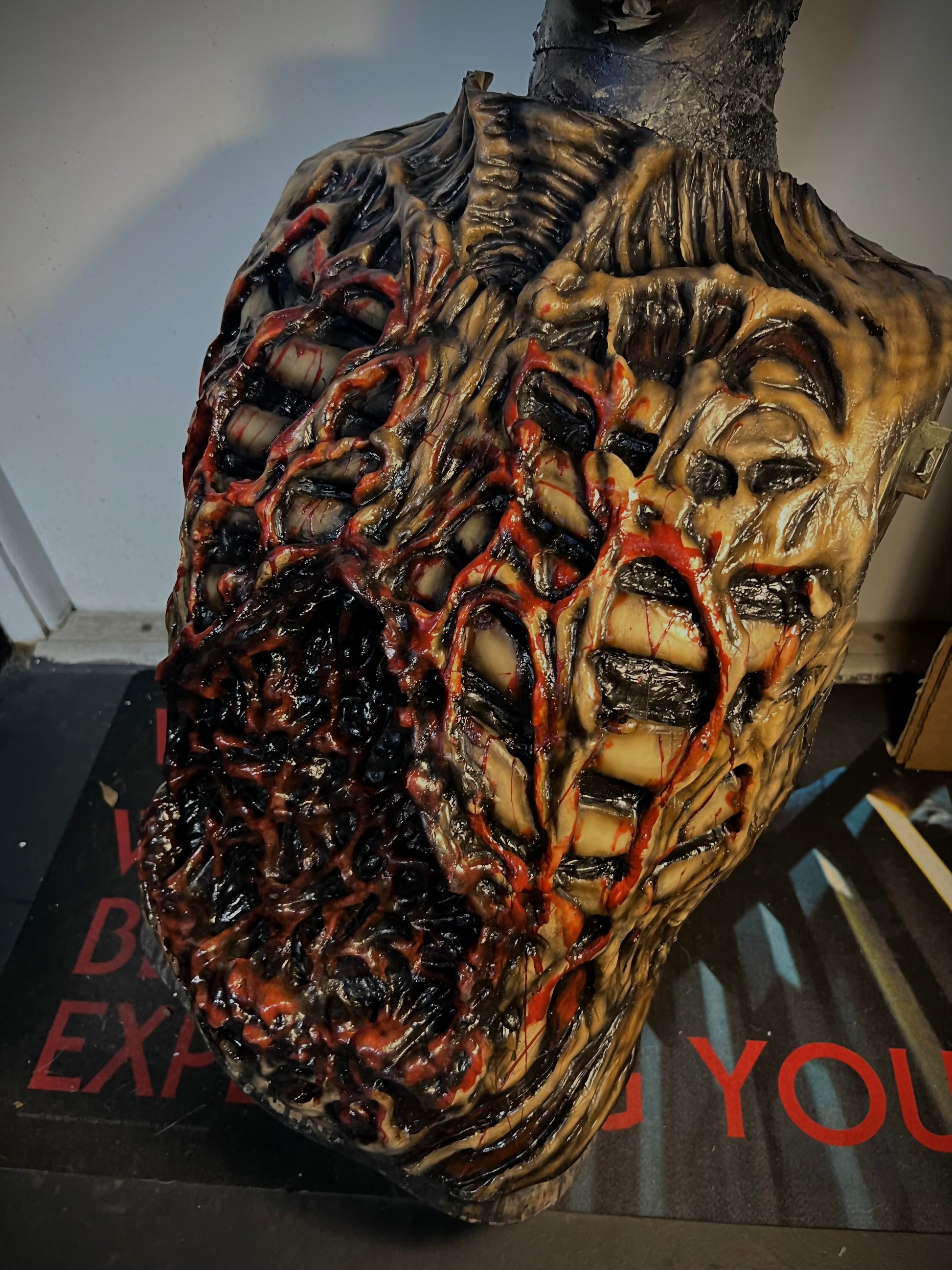 Thick latex corpse torso costume piece. Front only, straps in back.