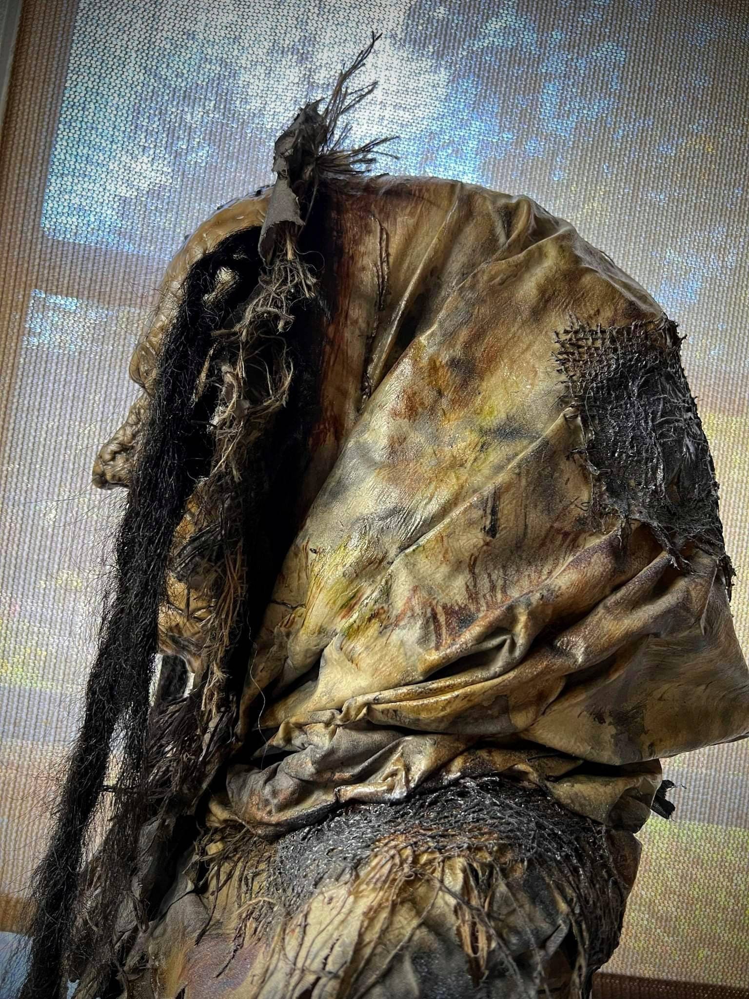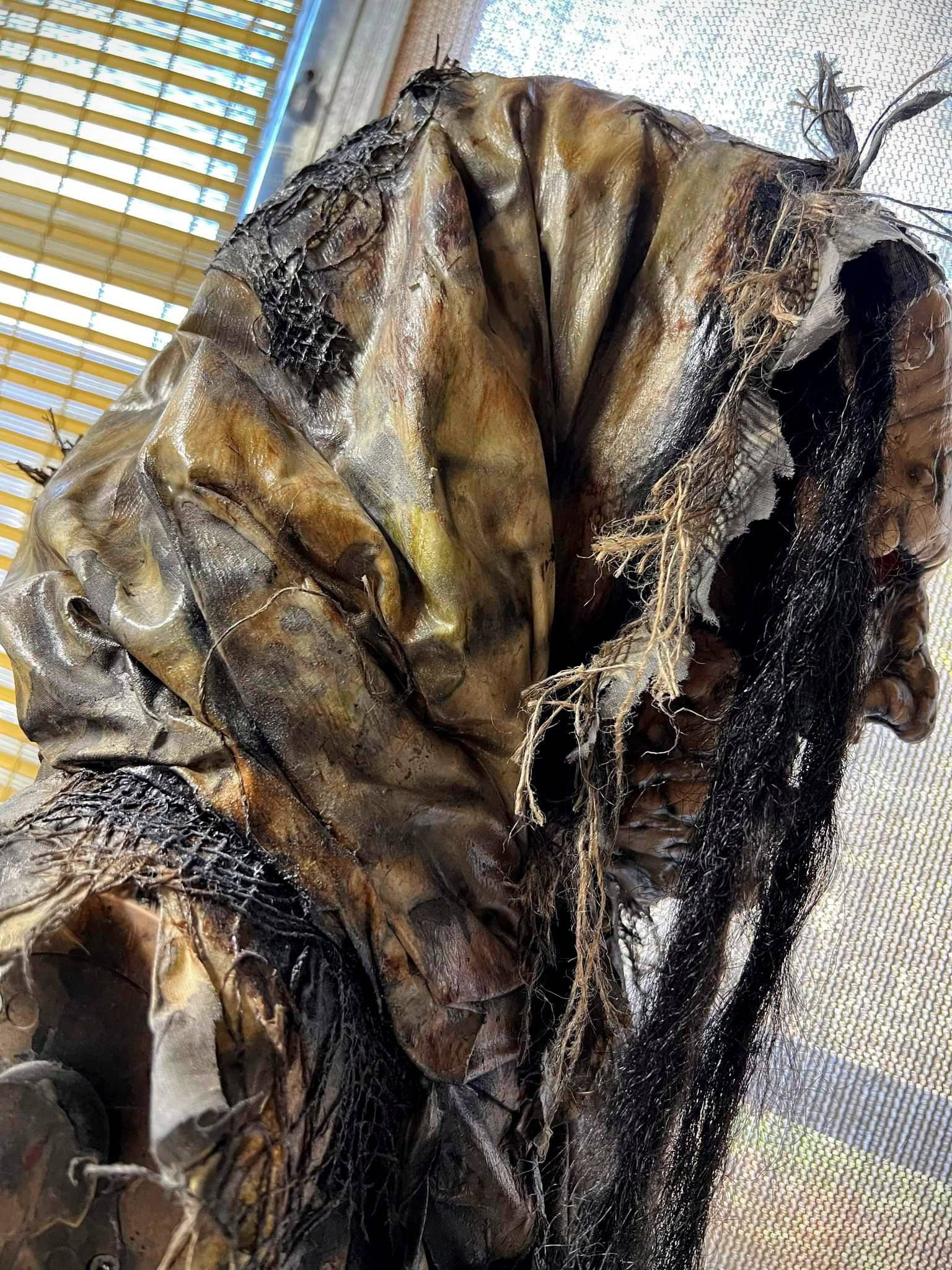 Latex mask. Latex muslin hood with burlap accents. Faux dreads. And strap inside.