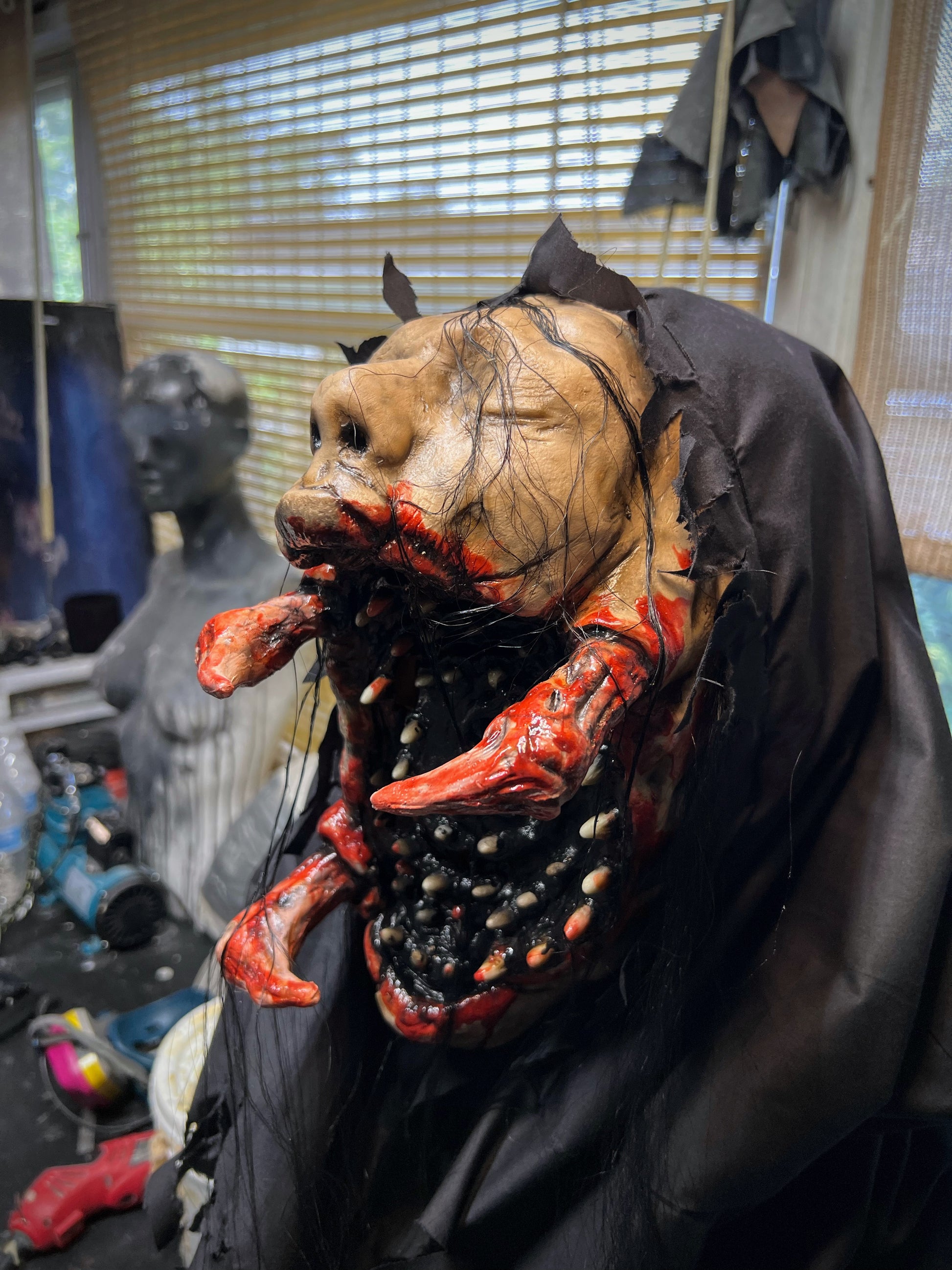 Latex half mask. Attached black fabric hood. Elastic strap. Foam insert. Yes, it has eye and breathing holes.